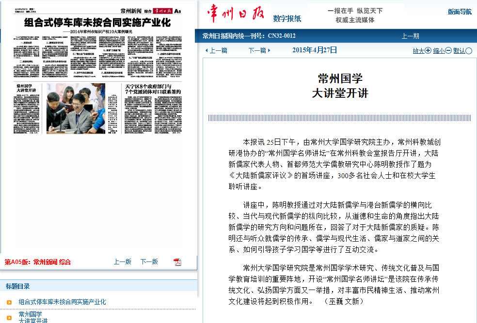 本报讯 25日下午,由常州大学国学研究院主办,常州科教城创研港协办的“常州国学名师讲坛”在常州科教会堂报告厅开讲,大陆新儒家代表人物、首都师范大学儒教研究中心陈明教授作了题为《大陆新儒家评议》的首场讲座,300多名社会人士和在校大学生聆听讲座。
