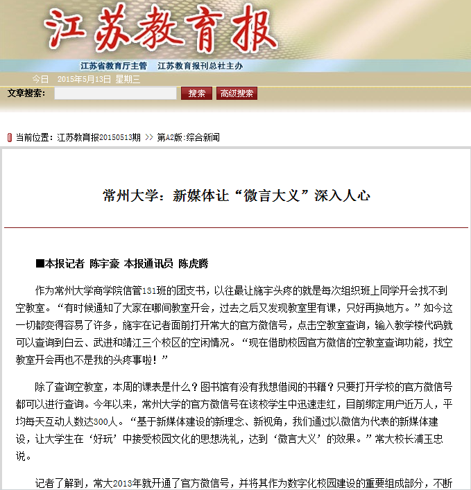除了查询空教室,本周的课表是什么?图书馆有没有我想借阅的书籍?只要打开学校的官方微信号都可以进行查询。今年以来,常州大学的官方微信号在该校学生中迅速走红,目前绑定用户近万人,平均每天互动人数达300人。“基于新媒体建设的新理念、新视角,我们通过以微信为代表的新媒体建设,让大学生在‘好玩’中接受校园文化的思想洗礼,达到‘微言大义’的效果。”常大校长浦玉忠说。
