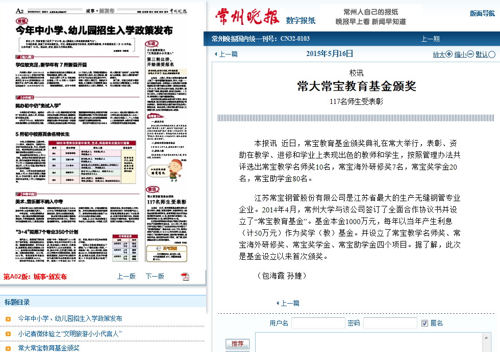 江苏常宝钢管股份有限公司是江苏省最大的生产无缝钢管专业企业。2014年4月,常州大学与该公司签订了全面合作协议书并设立了“常宝教育基金”。基金本金1000万元,每年以当年产生利息(计50万元)作为奖学(教)基金。并设立了常宝教学名师奖、常宝海外研修奖、常宝奖学金、常宝助学金四个项目。据了解,此次是基金设立以来首次颁奖。(包海霞 孙婕)