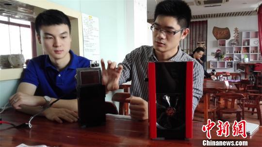 颜岩(左)和他的合伙人展示他们的最新研发成果。这款便携式降温仪可以不用加制冷剂的情况下产生低于环境10摄氏度的冷风,目前这项技术已审报专利。 唐娟 摄