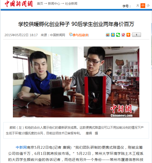 中新网南京5月22日电(记者 唐娟)“我们团队研制的便携式降温仪,刚被众筹公司估值千万,6月1日就将投放市场。”5月22日,常州大学环境学院土木工程系的大四学生颜岩兴奋的告诉记者,而他还有另外一个身份——常州市履道信息科技有限公司总经理。大一沉迷网络游戏,为买装备天天吃泡面的他,如今已是身价二百万的“90后”老板。