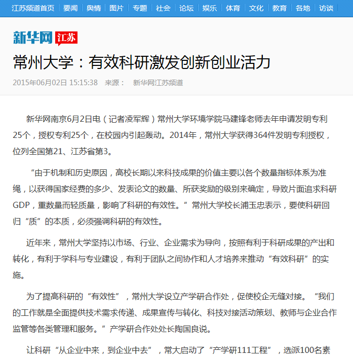 新华网南京6月2日电(记者凌军辉)常州大学环境学院马建锋老师去年申请发明专利25个,授权专利25个,在校园内引起轰动。2014年,常州大学获得364件发明专利授权,位列全国第21、江苏省第3。