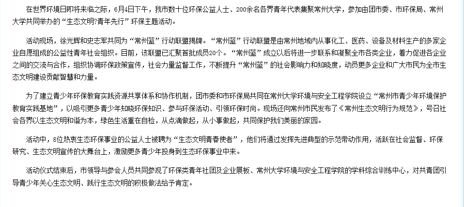 在世界环境日即将来临之际,6月4日下午,常州市数十位环保公益人士、200余名各界青年代表集聚常州大学,参加由团市委、市环保局、常州大学共同举办的“生态文明·青年先行”环保主题活动。