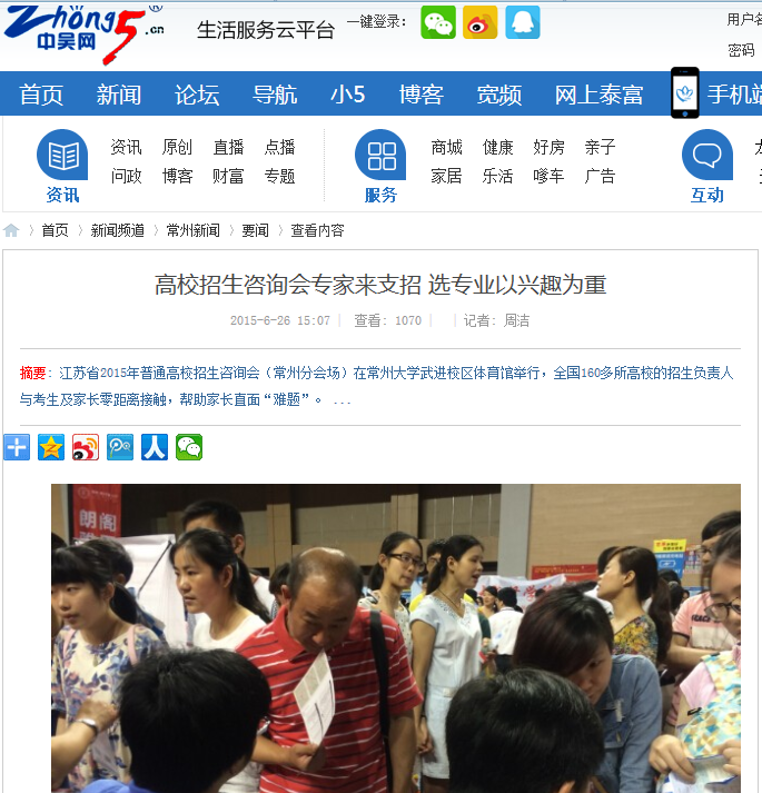 中吴网讯 从24日晚开始,2015江苏高考分数陆续公布。分数已经成为定数,但在“七分靠分数,三分靠志愿”的大环境下,如何填志愿成了家长这几天最“纠结”的事情。今天(6/26)上午,江苏省2015年普通高校招生咨询会(常州分会场)在常州大学武进校区体育馆举行,全国160多所高校的招生负责人与考生及家长零距离接触,帮助家长直面“难题”。