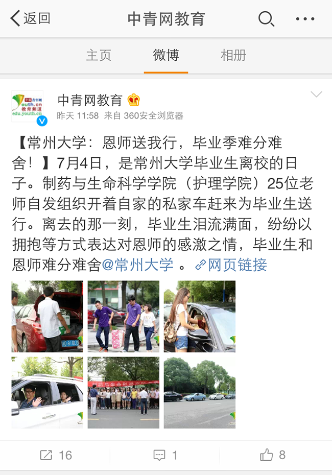 【常州大学:恩师送我行,毕业季难分难舍!】7月4日,是常州大学毕业生离校的日子。制药与生命科学学院(护理学院)25位老师自发组织开着自家的私家车赶来为毕业生送行。离去的那一刻,毕业生泪流满面,纷纷以拥抱等方式表达对恩师的感激之情,毕业生和恩师难分难舍@常州大学 。