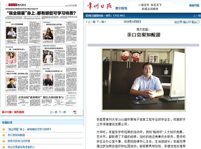 李超是常州大学2010届中爱电子信息工程专业的毕业生,现就职于江苏伟驰建设发展公司。