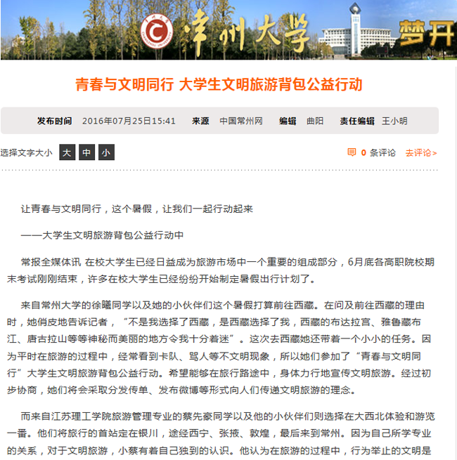 据了解这次“青春与文明同行”大学生背包行动是由常州市文明办、团市委、市旅游局等单位联合常州各高职院校共同开展。目的是加强青年人的文明旅游宣传引导工作,鼓励在常大学生参与到“文明旅游”宣传活动中来。