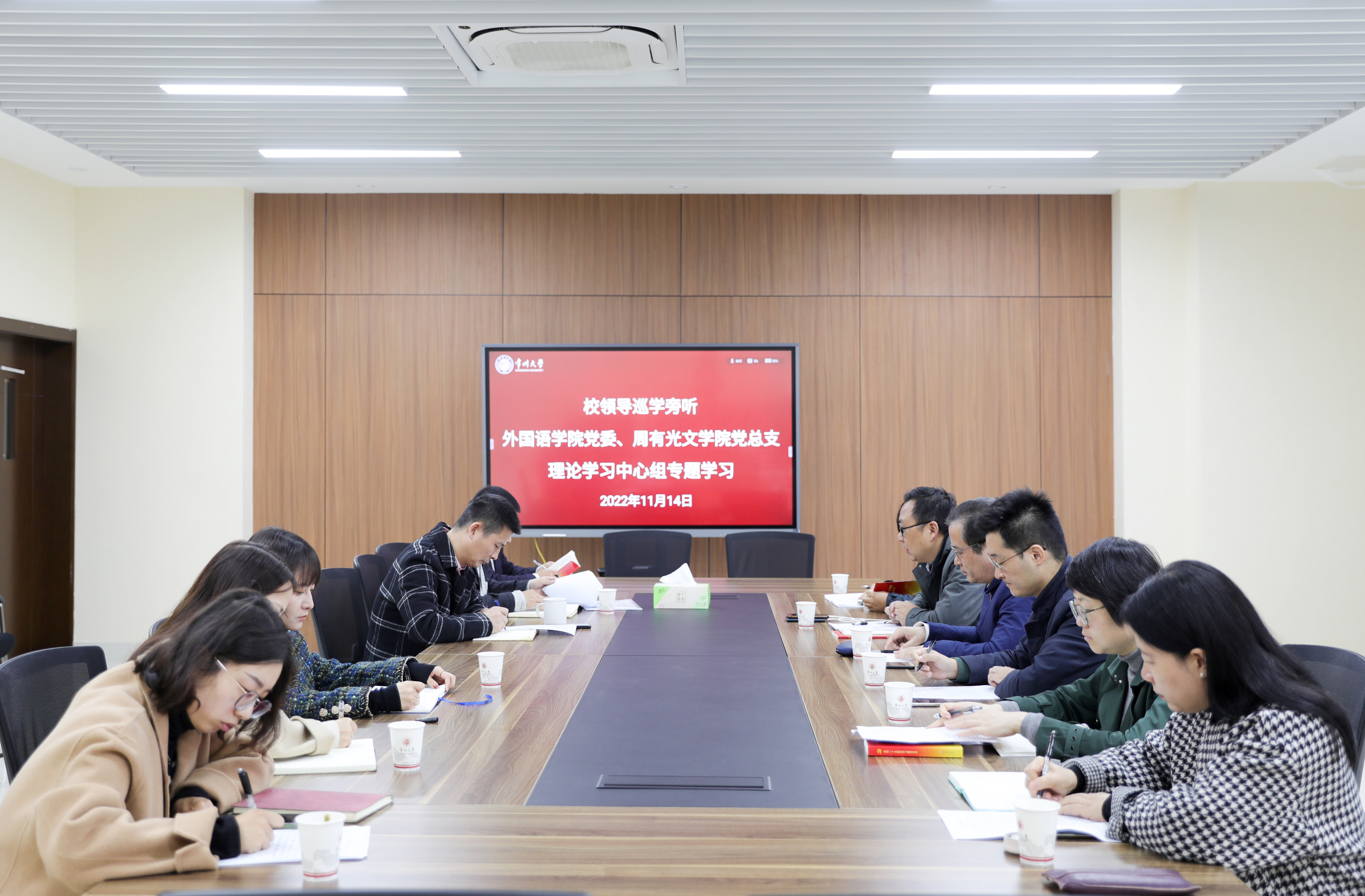 近日,党委常委、副校长徐树法巡学旁听外国语学院党委、周有光文学院党总支联合举行的党的二十大报告专题学习。外国语学院党委、周有光文学院党总支理论学习中心组成员参加专题学习并结合实际工作畅谈学习体会。