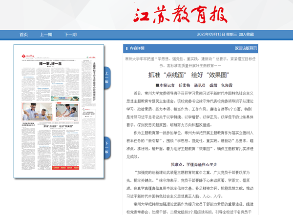 9月13日,《江苏教育报》以“抓准‘点线面’ 绘好‘效果图’”为题,报道我校高质量高标准开展学习贯彻习近平新时代中国特色社会主义思想主题教育的创新举措和丰硕成果。文章从“找准点,学懂弄通往心里走”“架好线,率先垂范往深里抓”“铺开面,立行立改往实里做”等方面阐述了我校把开展主题教育作为落实立德树人根本任务的“新引擎”,围绕“学思想、强党性、重实践、建新功”总要求,瞄准点、抓好线、铺开面,着力绘好主题教育“效果图”,确保主题教育扎实推进见成效。全文如下: