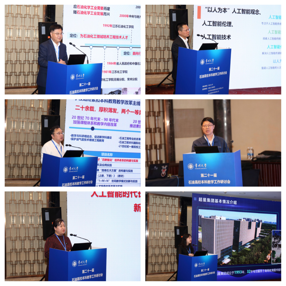 25日上午,论坛报告环节,中国石油大学(华东)党委常委、副校长周鹏,西南石油大学党委常委、副校长周莹依次主持会议。常州大学党委常委、副校长李忠玉作《产教融合视阈下常州大学石化类专业数智化改革与实践》报告、广东石油化工学院副校长万勇作《AI赋能,四链融合—深化政产学研用协同育人,培养绿色石化高素质人才》报告、西南石油大学教务处处长廖柯熹作《服务国家能源战略的“一体双链”产教深度融合人才培养模式构建与实践》报告、中国石油大学(华东)教务处副处长王荣明作《产教融合协同育人的石大探索与实践》报告、长江大学本科生院副院长张引弟作《人工智能时代长江大学油气类产教融合、拔尖创新人才培养机遇与挑战》报告、超星泛雅集团副总宋瑛作《人工智能赋能教学的探索与实践》报告。