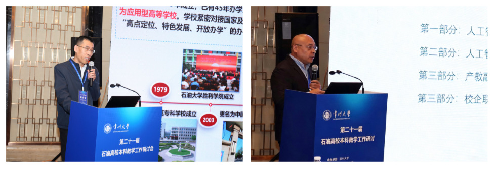 25日下午,论坛报告环节,李忠玉、万勇依次主持会议。东北石油大学教务处处长成庆林作《问题导向·关键切口·贯彻到底——切实提升应用型本科人才培养质效的思考》报告、西安石油大学教务处处长张益作《数智驱动本科教育西石大探索与实践》报告、重庆科技大学教务处处长秦跃林作《“四新”协同:行业特色院校产教融合培养卓越工程人才的十年改革与实践》报告、中国石油大学(北京)本科生院副处长宋健斐作《面向国家战略需求的高层次人才产教融合培养探索与实践》报告、辽宁石油化工大学教务处副处长高兴军作《产教融合视域下“石化+智能+绿色+安全”卓越工程人才培养的探索与实践》报告、北京石油化工学院教务处副处长刘昱作《深耕实践育人 推进产教融合,全力打造首善之区工程师摇篮》报告、山东石油化工学院教务处副处长杜春安作《面向区域 融合发展 培养应用型人才》报告、北京智启蓝墨信息技术有限公司董事长靳新作《人工智能时代产教融合联合研制课程教材的平台机制》报告。