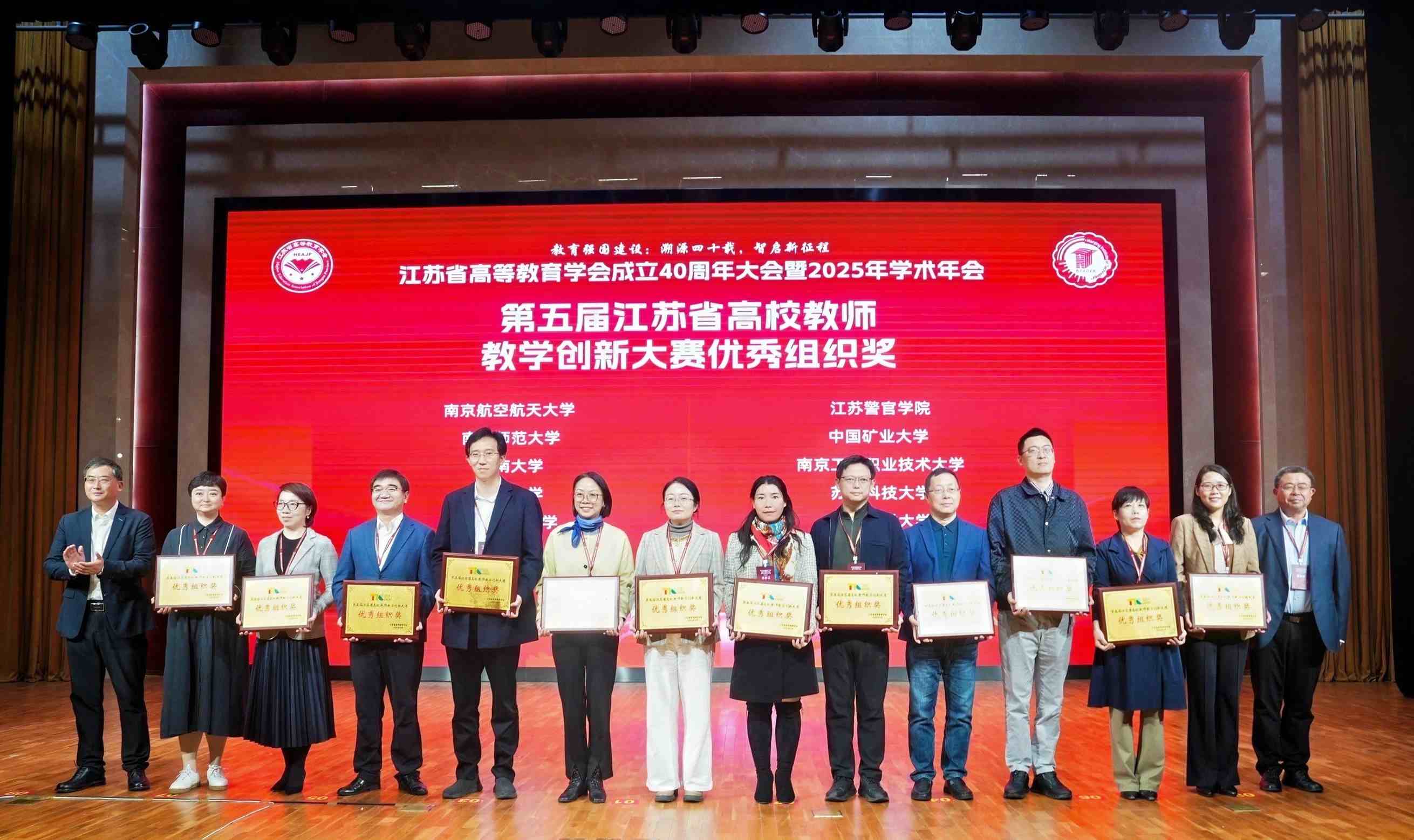 本届大会以“教育强国建设:溯源四十载,智启新征程”为主题,来自省内外学会代表、教育行政部门负责人、高校负责人、专家学者及学会理事监事等400余人参会,共绘教育强国背景下的江苏高质量人才自主培养新蓝图。会上,我校喜获多项荣誉。校党委书记徐守坤教授作为第一作者发表的论文《高校产教融合高质量发展:国际经验、中国优势与未来图景》(成果署名:徐守坤、李忠玉、王建慧)和国家教学名师邵辉教授作为第一作者发表的论文《本科人才培养的教育思考与实践》(成果署名:邵辉、徐守坤、邵小晗、李忠玉、毕海普),分获江苏省高等教育学会2024年度高等教育科学研究优秀成果特等奖与一等奖。学校被授予第五届江苏省本科高校教师教学创新大赛“优秀组织奖”。(通讯员/李每佳 审核/莫琦 编辑/庄媛)