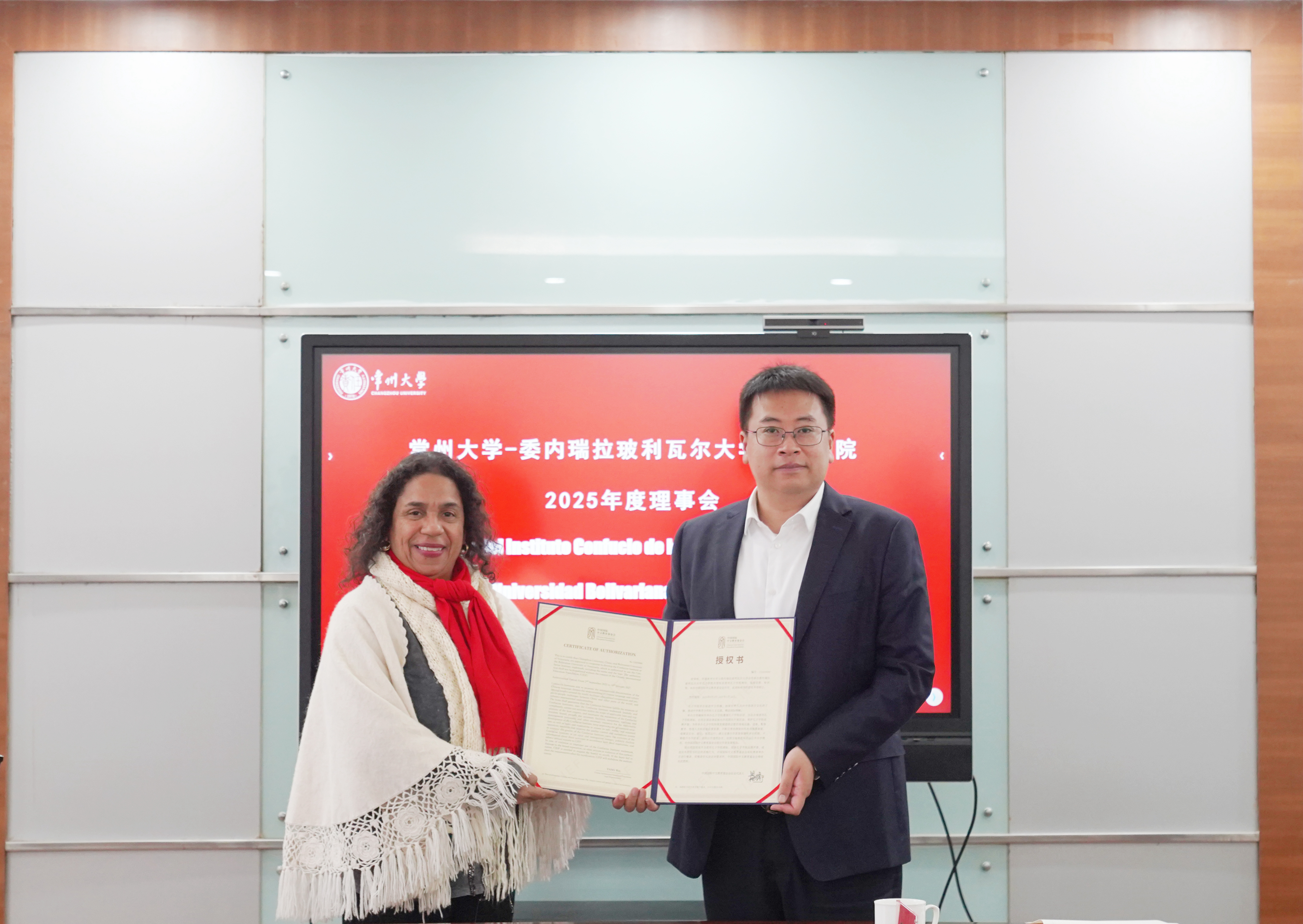 会上,李亚飞向委内孔院转交了孔子学院品牌授权书。理事会通报了成员变动情况,审议通过了委内孔院2025年度工作报告、2025年度决算报告、2026年度工作计划及2026年度预算计划。