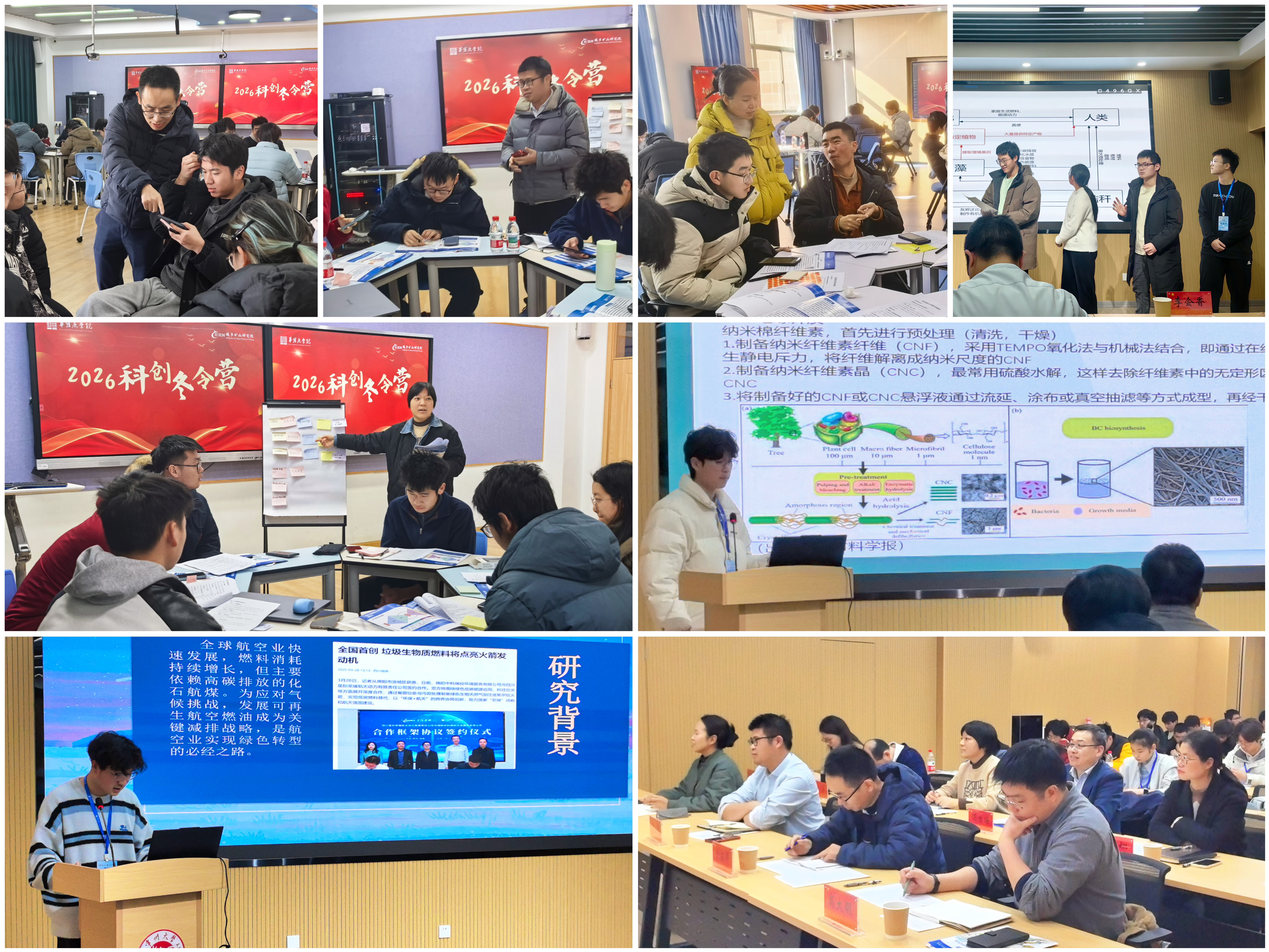 作为本次冬令营的核心板块之一,“碳”索新路训练营在城乡矿山研究院大力支持下,成为“学院-研究院协同育人”机制的重要实践。该板块紧扣“双碳”目标,聚焦生物炼制、循环经济等国家战略领域,通过主旨报告、专题沙龙及综合实验等形式,引导学生深入理解生物质资源转化的技术路径与高值化应用场景。在设计思维工作坊与创新设计大赛中,同学们跨校组队、互相启发,围绕废弃塑料分级热解制氢、农林废弃物制备淀粉、藻类生物质高值转化、基于纤维素的超级电容器开发等8个方向开展方案设计与探究,在模拟真实科研流程中提升解决复杂工程问题的能力。