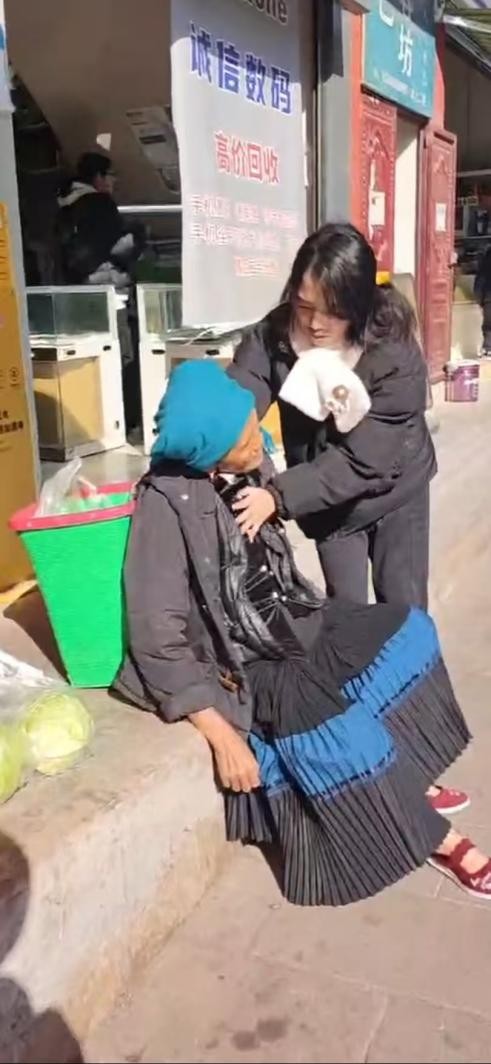 当天中午11时许,泸沽湖大道街边围着一群人。杨花同学走近时才发现人群中围着一位老奶奶。老人瘫坐在路边台阶上,浑身僵硬、面色苍白,挣扎在昏迷与清醒之间。“周围围着很多人,但是没有一个人敢出手救援。我当时也有点犹豫,害怕施救会不会反而被老奶奶和她家属讹上。但我再一想,我就是学护理的,我不上前自己心里都过意不去。”想到这儿,杨花顾不上其他,让弟弟杨虎维持秩序,自己则推开人群站到了老人身边。