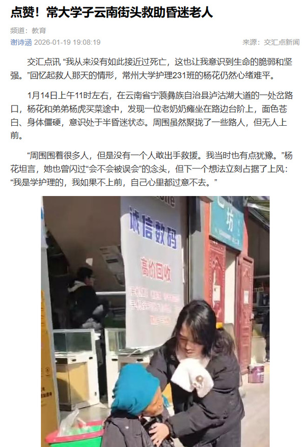 目前,老人已转危为安,杨花也回归了日常学习生活。谈及这次经历,她语气谦逊:“这只是一件小事。”但行动的背后,是她一贯的选择:从梦想当警察到选择护理专业,再到入学后主动参与志愿服务,在她看来,该出手时就出手,早已成为一种本能。