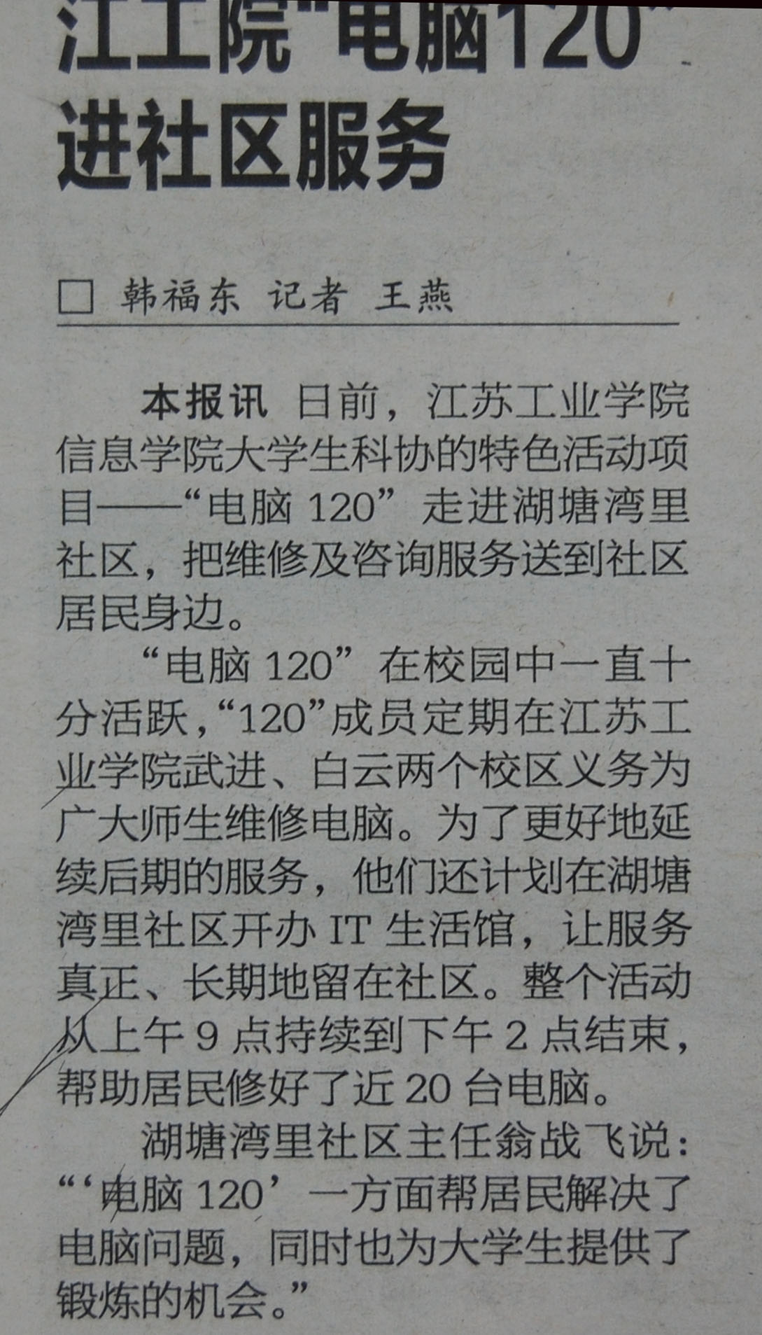 “电脑120”在校园中一直十分活跃,“120”成员定期在江苏工业学院武进、白云两个校区义务为广大师生维修电脑。为了更好地延续后期的服务,他们还计划在湖塘湾里社区开办IT生活馆,让服务真正、长期地留在社区。整个活动从上午9点持续到下午2点结束,帮助居民修好了近20台电脑。