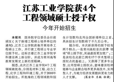 江苏工业学院获4个工程领域硕士授予权 今年开始招生