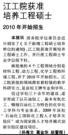 本报讯 国务院学位委员会近日颁发了《关于新增工程硕士培养单位的通知》,江工院获准开展培养工程硕士工作,并行使工程硕士专业学位授予权。