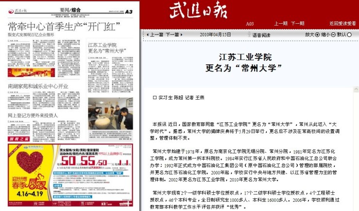 武进日报报道我校更名新闻发布会 江苏工业学院更名为“常州大学”