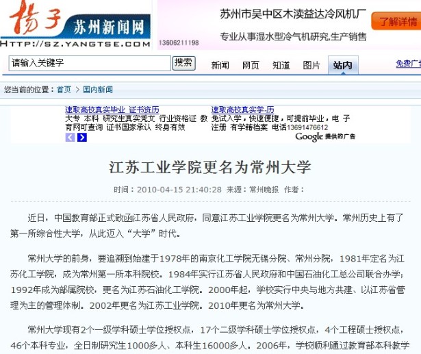 扬子-苏州新闻网报道我校更名新闻 江苏工业学院更名为常州大学
