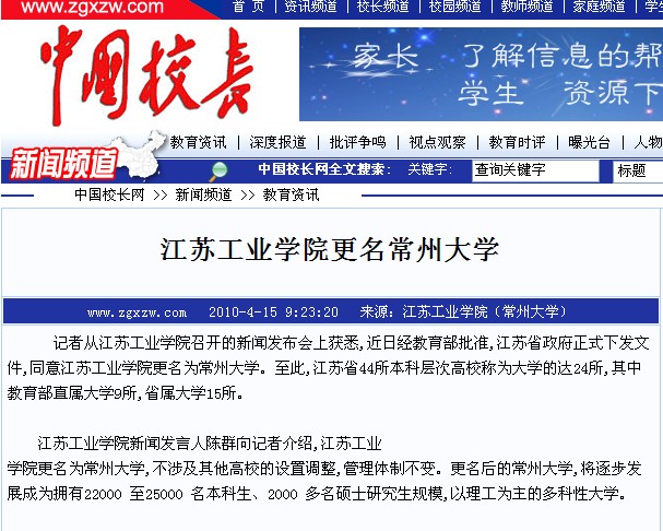 中国校长网报道我校更名新闻发布会 江苏工业学院更名为常州大学