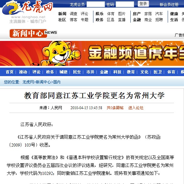 龙虎网报道我校更名新闻 教育部同意江苏工业学院更名为常州大学