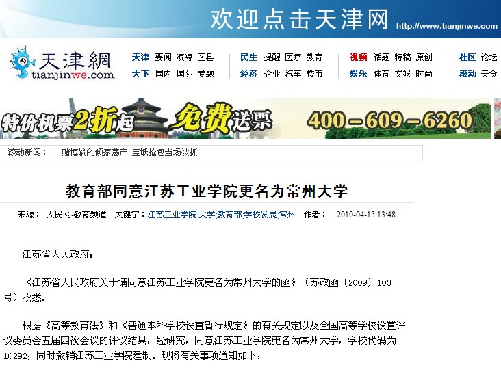 天津网报道我校更名新闻 教育部同意江苏工业学院更名为常州大学