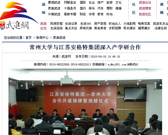 武进网讯(记者 韩小刚)校企联动、合作共赢,常州大学刚刚更名成功,就与武进高新技术企业江苏安格特集团建立起新的产学研合作关系,从而成功迈出了新时期深化内涵发展的第一步。在4月16日上午举行的江苏安格特集团与常州大学合作共建揭牌捐赠仪式上,合作双方就深入合作相关事宜进行了交流。