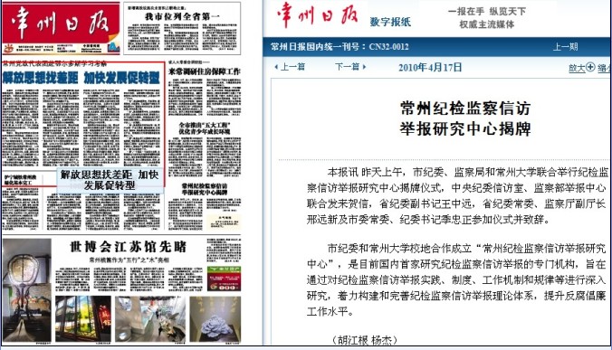 市纪委和常州大学校地合作成立“常州纪检监察信访举报研究中心”,是目前国内首家研究纪检监察信访举报的专门机构,旨在通过对纪检监察信访举报实践、制度、工作机制和规律等进行深入研究,着力构建和完善纪检监察信访举报理论体系,提升反腐倡廉工作水平。