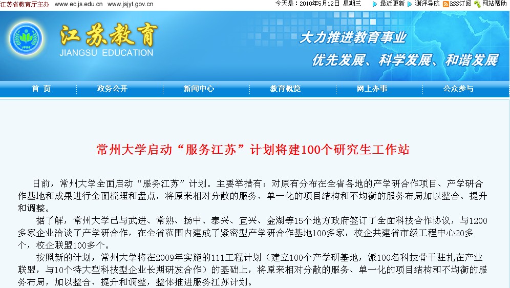 日前,常州大学全面启动“服务江苏”计划。主要举措有:对原有分布在全省各地的产学研合作项目、产学研合作基地和成果进行全面梳理和盘点,将原来相对分散的服务、单一化的项目结构和不均衡的服务布局加以整合、提升和调整。