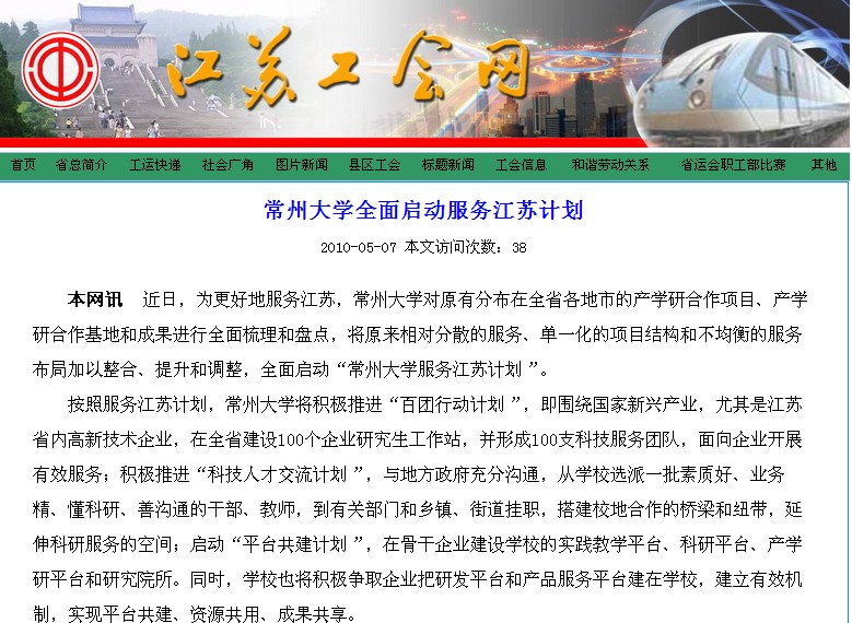 据悉,2010年,江苏工业学院成功更名为常州大学,社会各界对常州大学的到来、常州大学的发展,有着很高的期望和美好的憧憬。常州大学作为常州九校联动服务地方的牵头单位,也是全省高校服务地方的典范。在科技、人才、公共平台等方面服务江苏有传统、有经验、更有实力。罗志军省长在考察常州大学产学研合作基地时,就曾充分肯定常州大学服务地方、服务行业,产学研合作出成绩的特色和传统,希望常州大学能为江苏经济社会发展,尤其是产业结构调整作出更大的贡献。为更好地服务江苏,常州大学决定全面实施“服务江苏计划”。