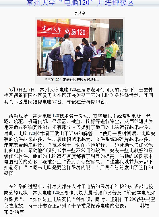 5月3日至5日,常州大学电脑120在指导老师何可人的带领下,走进钟楼区河景花园小区及周边小区开展为期三天的电脑义务维修活动,其间共为小区居民维修电脑27台,登记在册待修13台。