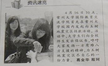 江南时报报道我校国际学院向玉树灾区捐款新闻