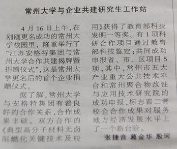 江南时报报道我校与新闻 常州大学与企业共建研究生工作站