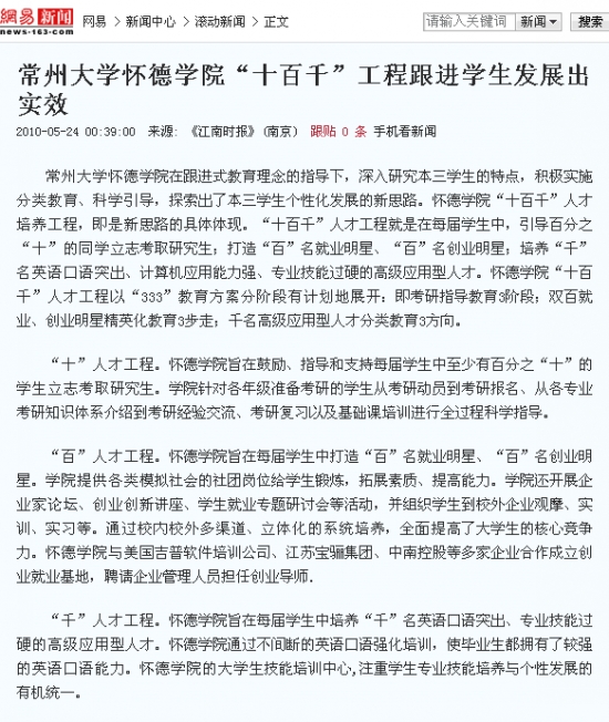 “十百千”人才工程,立足本三学生实际,跟进学生发展期望,推行至今取得了可喜成效。2010届毕业生中有56名考研上线,其中化学化工类专业考研上线率达到13.7%,2007级备战考研学生215人,占07级学生总数的16%。2010年,怀德学院共有15名学生获得国家省级表彰,3项科技创新作品受到省级表彰,8项大学生创新作品受校创新基金资助。良好的学习氛围和个性化发展空间,让怀德学院大学生的发展得到了双重保障。