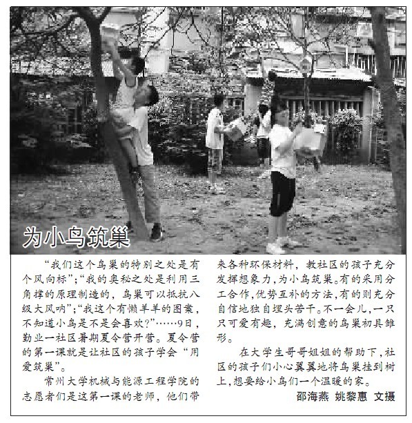 “我们这个鸟巢的特别之处是有个风向标”;“我的奥秘之处是利用三角撑的原理制造的,鸟巢可以抵抗八级大风呐”;“我这个有懒羊羊的图案,不知道小鸟是不是会喜欢?”……9日,勤业一社区暑期夏令营开营。夏令营的第一课就是让社区的孩子学会“用爱筑巢”。