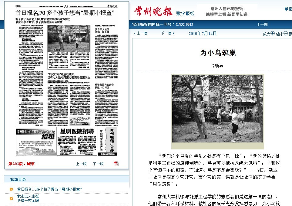 常州大学机械与能源工程学院的志愿者们是这第一课的老师,他们带来各种环保材料,教社区的孩子充分发挥想象力,为小鸟筑巢。有的采用分工合作,优势互补的方法,有的则充分自信地独自埋头苦干。不一会儿,一只只可爱有趣,充满创意的鸟巢初具雏形。