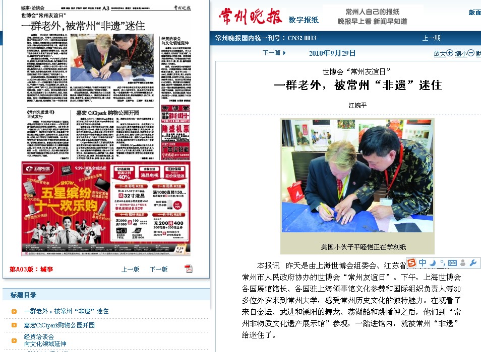在金坛刻纸展位,来自美国馆的平睦恺(中文名)正专心致志地在工作台上刻着纸呢。传承人杨兆群一刀一刀地教着这个临时来的洋学生。平睦恺个子高高,中文说得倍儿好。原来,他在清华大学学了8年中文,是北京外国语学院的外教老师。他刻了一条鱼,经过杨兆群的修改后,宝贝似地塞到了自己的胸牌里。他说,他很喜欢刻纸艺术,以前在西安和北京都见过,觉得很美,所以一见到精美绝伦的金坛刻纸立马就被迷住了。临走前,杨兆群给了他一个更难的图案,让他回家自己学着刻。平睦恺问老师要了联系方式,说到时刻好后要拍了照寄给老师看。