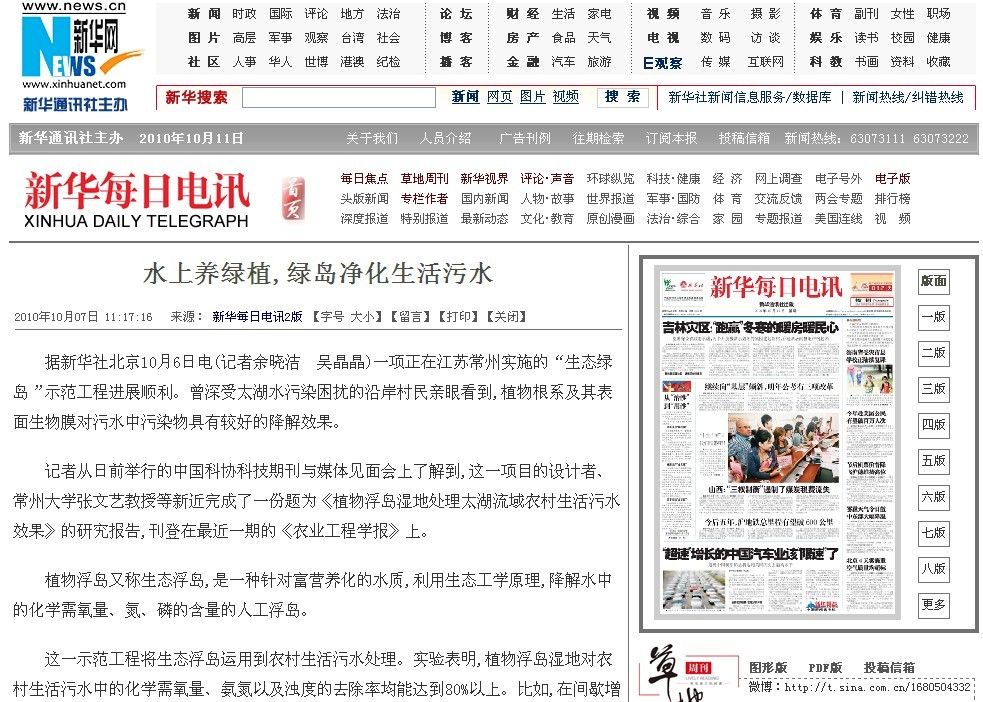 记者从日前举行的中国科协科技期刊与媒体见面会上了解到,这一项目的设计者、常州大学张文艺教授等新近完成了一份题为《植物浮岛湿地处理太湖流域农村生活污水效果》的研究报告,刊登在最近一期的《农业工程学报》上。