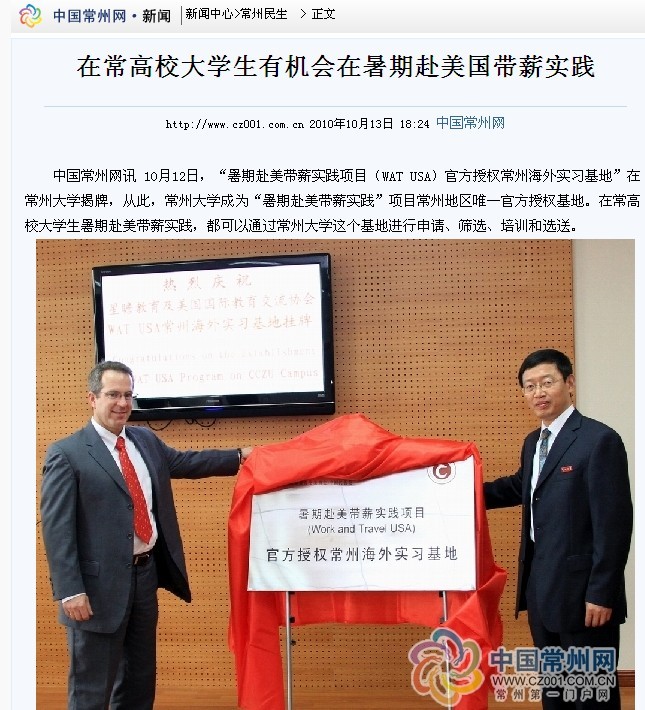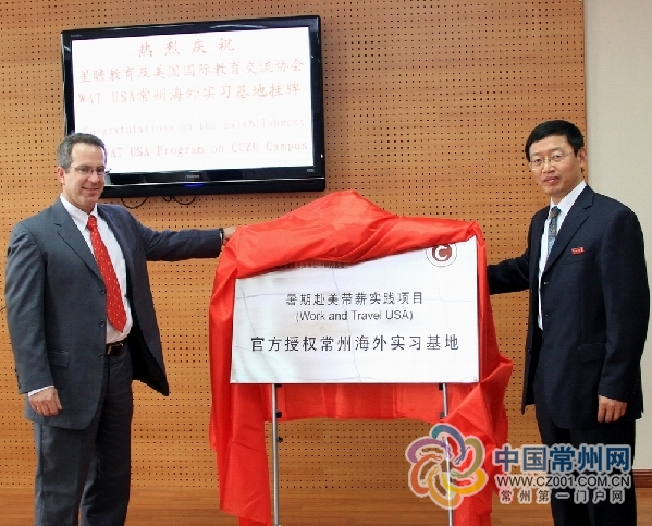 中国常州网讯 10月12日,“暑期赴美带薪实践项目(WAT USA)官方授权常州海外实习基地”在常州大学揭牌,从此,常州大学成为“暑期赴美带薪实践”项目常州地区唯一官方授权基地。在常高校大学生暑期赴美带薪实践,都可以通过常州大学这个基地进行申请、筛选、培训和选送。