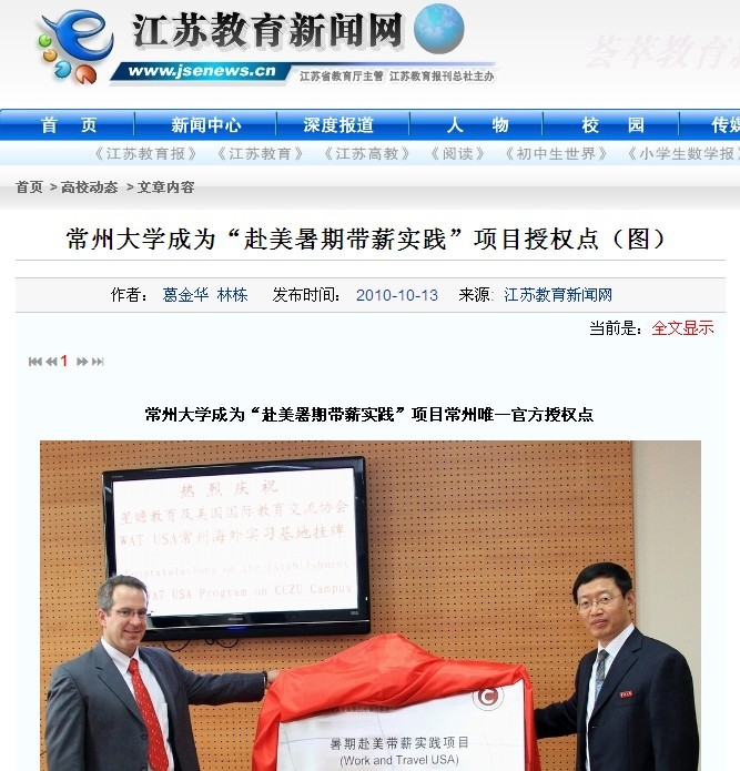 10月12日,美国国际教育交流协会(CIEE)中国代表处星瞻教育集团(Student Quest)中国区总裁蒂姆•布赖恩特(Tim Bryant)和常州大学副校长孙小强共同为“赴美暑期带薪实践(WAT USA)官方授权常州海外实习基地”揭牌。从此,常州大学成为“暑期赴美带薪实践”项目常州地区唯一官方授权基地。在常高校大学生暑期赴美带薪实践,都可以通过常州大学这个基地进行申请、筛选、培训和选送。