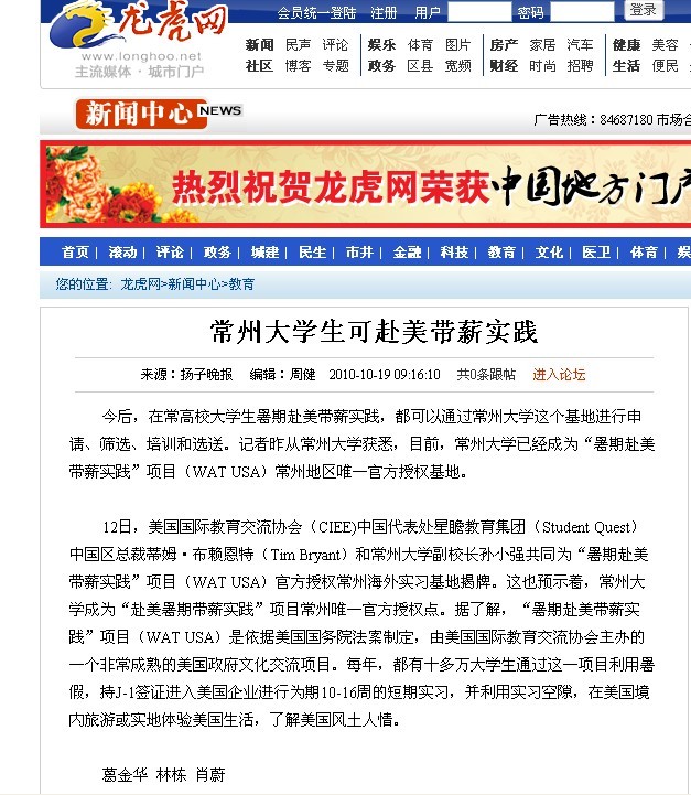 12日,美国国际教育交流协会(CIEE)中国代表处星瞻教育集团(Student Quest)中国区总裁蒂姆·布赖恩特(Tim Bryant)和常州大学副校长孙小强共同为“暑期赴美带薪实践”项目(WAT USA)官方授权常州海外实习基地揭牌。这也预示着,常州大学成为“赴美暑期带薪实践”项目常州唯一官方授权点。据了解,“暑期赴美带薪实践”项目(WAT USA)是依据美国国务院法案制定,由美国国际教育交流协会主办的一个非常成熟的美国政府文化交流项目。每年,都有十多万大学生通过这一项目利用暑假,持J-1签证进入美国企业进行为期10-16周的短期实习,并利用实习空隙,在美国境内旅游或实地体验美国生活,了解美国风土人情。