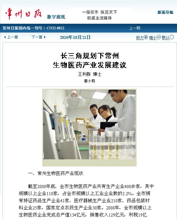 以上是笔者对长江三角洲地区区域规划下常州生物医药产业发展的思考,不够成熟,也不够全面,希望以此激起大家对常州生物医药产业的关注。