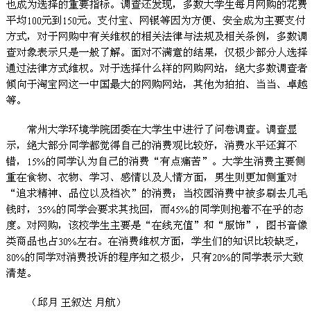 常州大学环境学院团委在大学生中进行了问卷调查。调查显示,绝大部分同学都觉得自己的消费观比较好,消费水平还算不错,15%的同学认为自己的消费“有点痛苦”。大学生消费主要侧重在食物、衣物、学习、感情以及人情方面,男生则更加侧重对“追求精神、品位以及档次”的消费;当校园消费中被多刷去几毛钱时,35%的同学会要求其找回,而45%的同学则抱着不在乎的态度。对网购,该校学生主要是“在线充值”和“服饰”,图书音像类商品也占30%左右。在消费维权方面,学生们的知识比较缺乏,80%的同学对消费投诉的程序知之极少,只有20%的同学表示大致清楚。