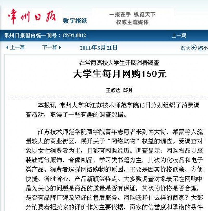 3月21日,常州日报以《大学生每月网购150元——在常两高校开展消费调查》为题,报道环境学院学生开展消费调查。
