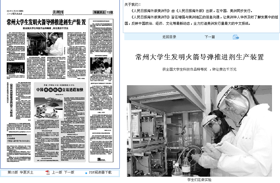 近日,从常州大学传出喜讯,该校8位大学生在老师的指导下,利用课外时间刻苦攻关,发明了更适合生产的火箭推进剂主要原料——硝基胍的微通道反应器,并设计了相应的工艺路线。该项目荣获第十三届“挑战杯”全国大学生课外学术科技作品特等奖。目前,常州大学已经为该项目申请了两项国家专利,并与当地一家化工企业达成了技术转让协议,转让费达1000万元。