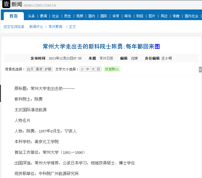 中国常州网讯 记者20日从常州大学获悉,中国工程院新科院士陈勇曾在常州大学(原江苏化工学院)工作15年,一直与常大保持密切联系,近年来促成了中国科学院广州能源研究所与常州大学签订全面合作协议。他也是继张全兴院士之后从常大走出的第二位院士。