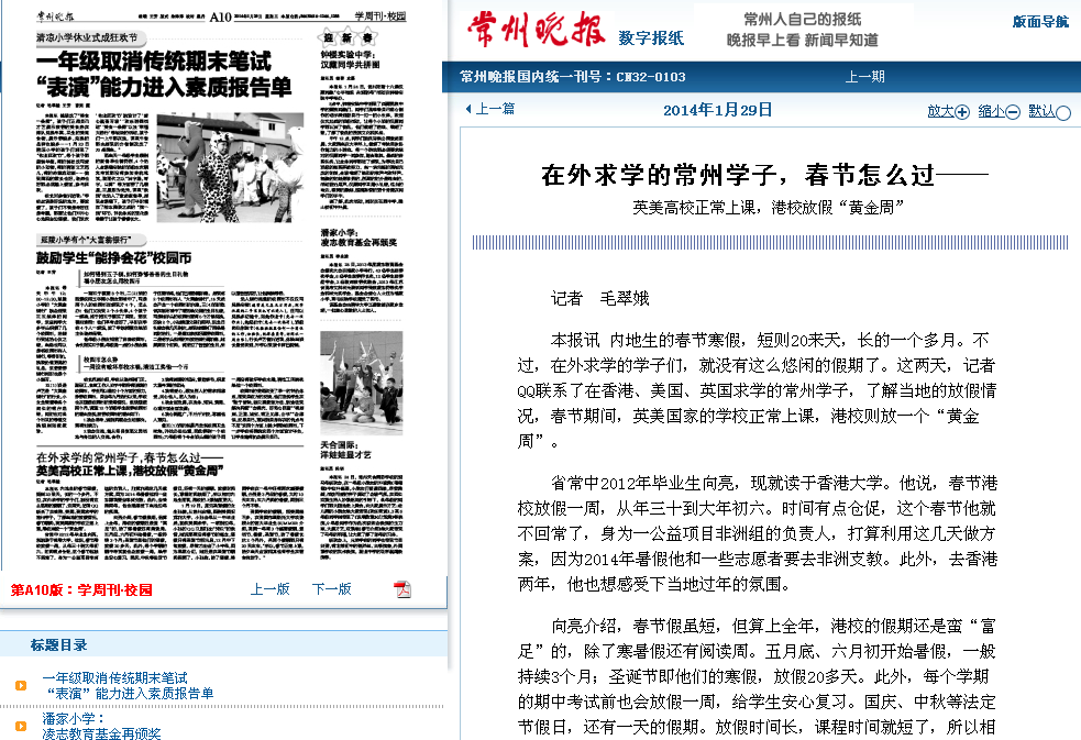 本报讯 内地生的春节寒假,短则20来天,长的一个多月。不过,在外求学的学子们,就没有这么悠闲的假期了。这两天,记者QQ联系了在香港、美国、英国求学的常州学子,了解当地的放假情况,春节期间,英美国家的学校正常上课,港校则放一个“黄金周”。