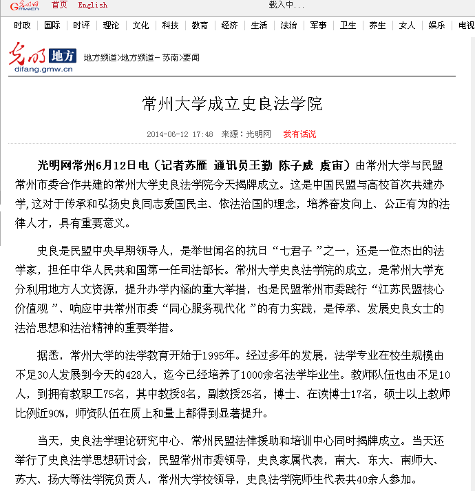 当天,史良法学理论研究中心、常州民盟法律援助和培训中心同时揭牌成立。当天还举行了史良法学思想研讨会,民盟常州市委领导,史良家属代表,南大、东大、南师大、苏大、扬大等法学院负责人,常州大学校领导,史良法学院师生代表共40余人参加。